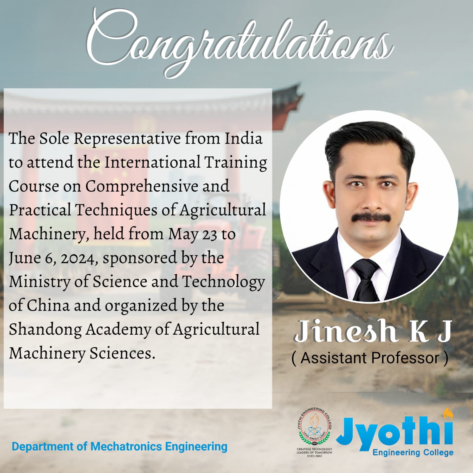 Mr. Jinesh K. J. Selected as India's Sole Representative for International Agricultural Machinery Training in China