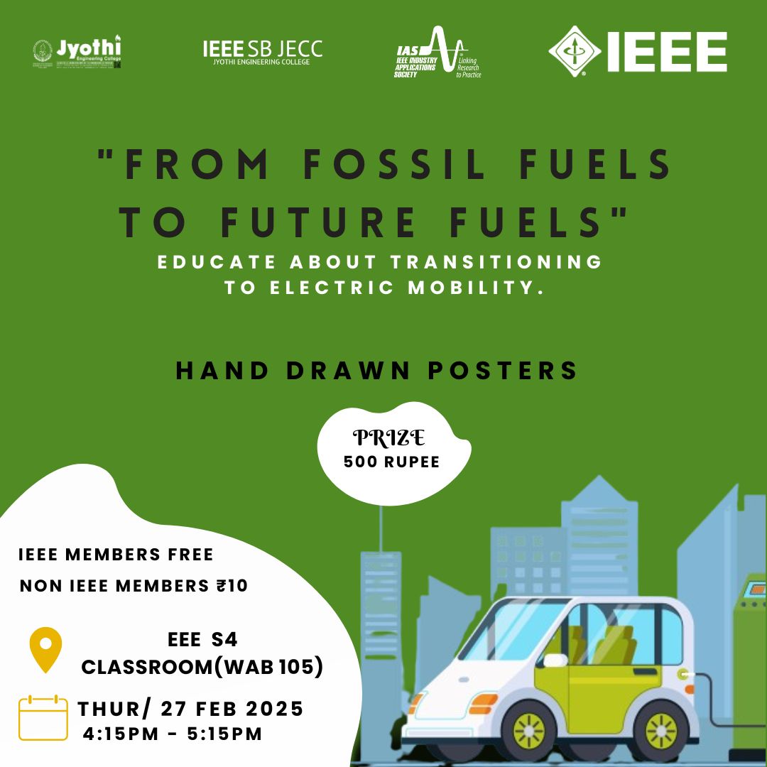 IEEE IAS SBC JECC, in collaboration with IEEE SB JECC, proudly presents an exciting Hand-Drawn Poster Making Competition designed to spark creativity and innovation. This event invites participants to explore the critical transition "From Fossil Fuels to Future Fuels", showcasing artistic perspectives on sustainable energy solutions that will shape our future.